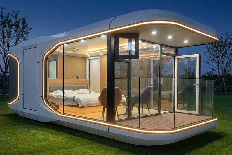 舱体采用圆润流畅的一体化造型,线条柔和且富有质感,哑光白外壳搭配利落的轮廓设计,自带简约高级的视觉效果,无需复杂土建即可快速落地,适配营地、景区、乡村庭院、城市露台等多种场景,无论是作为旅居住宿、休闲茶室还是办公空间,都能轻松适配。舱体配备大面积全景玻璃窗,搭配侧开式通风窗设计,兼顾采光与通风需求,让室内通透明亮;简约的外观设计可根据不同场景进行色彩与外观定制,适配多种项目风格。舱体选用高强度环保材料与专业保温隔热工艺打造,具备优异的防风抗震、耐候抗腐性能,可适配不同气候与环境的使用需求,兼顾耐用性与安全性。