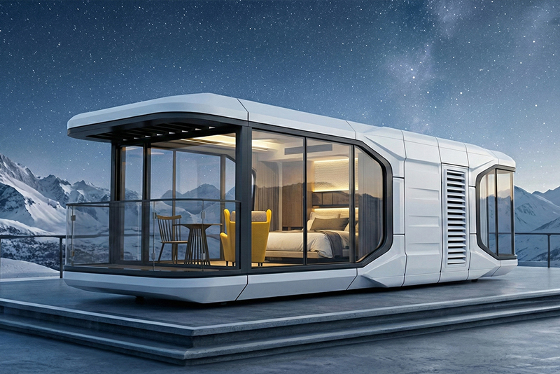 S3 系列是我们太空舱民宿房屋的旗舰产品,专为追求极致科技体验与未来感的用户打造。采用航空级铝合金外壳,流线型飞船设计,搭载全屋最高标准智能系统。适用于高端营地、科幻主题酒店及私人度假屋。